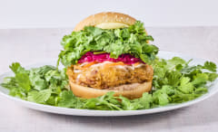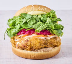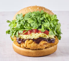 昨年販売され、復活候補のグリーンカレー・バインミー・ガパオ・トムヤムクンの中から1位となったバーガー。クリスピーチキンに、レバーペーストのコク、ほどよい酸味のなます、紫キャベツのマリネを合わせ、五香粉とナンプラーで本場の味を表現した。パクチーの爽やかな香りを重ねることで、奥行きのある味わいとなっている。