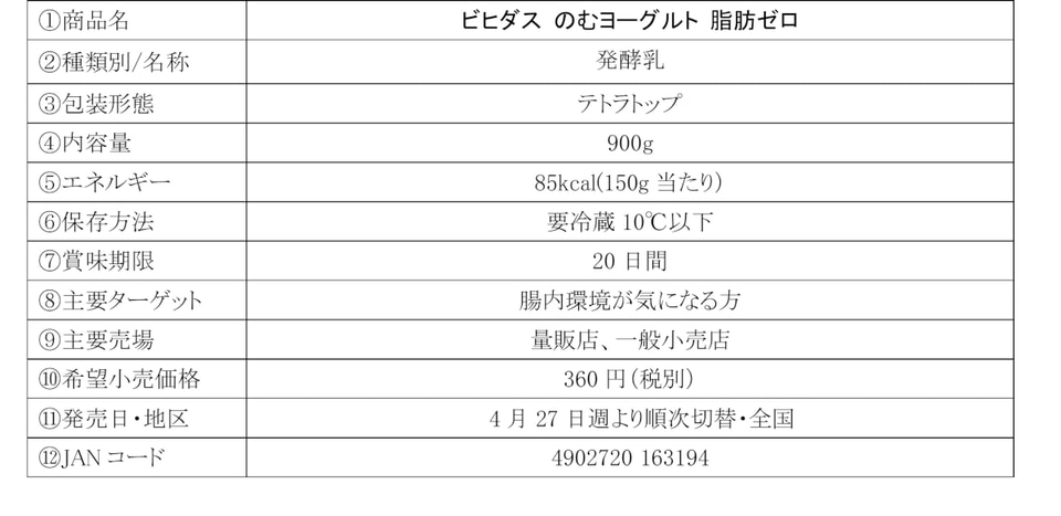 ニュース森永乳業「ビフィズス菌 BB536」が生きて腸まで届く「ビヒダス のむヨーグルト 脂肪ゼロ」を機能性表示食品にリニューアル 編集部:田中里実2026年4月27日 07:002026年4月27日から順次発売森永乳業「ビヒダス のむヨーグルト 脂肪ゼロ」 森永乳業は「ビヒダス のむヨーグルト 脂肪ゼロ」を機能性表示食品としてリニューアルし、4月27日の週から順次発売する。内容量は900gで、価格は360円前後(税別)。 生きて大腸まで届き、腸内環境を整える機能が報告されている「ビフィズス菌 BB536」20億個を機能性関与成分とし、まろやかな味わいはそのままにおなかの健康価値を強化した。脂肪ゼロタイプのため、脂質を気にしている人も続けやすいという。 商品概要
