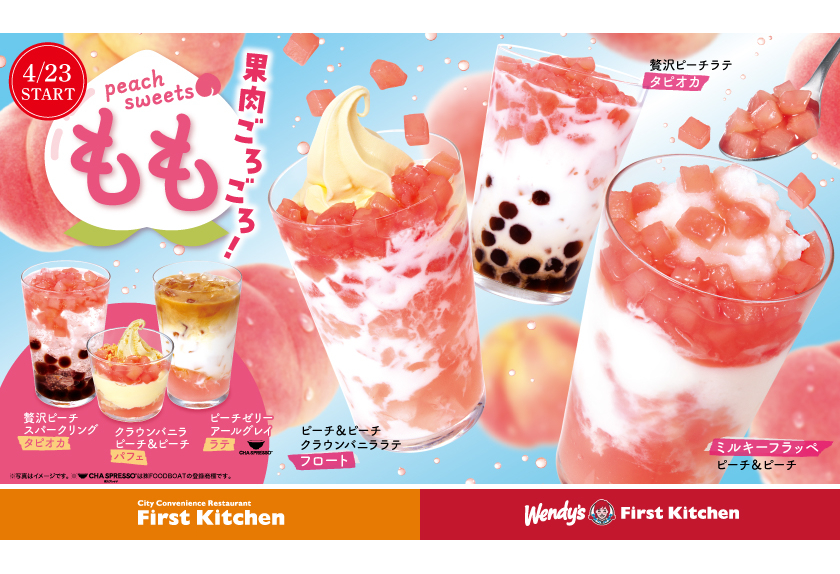 ウェンディーズ・ジャパンとファーストキッチンは、「ミルキーフラッペ ピーチ&ピーチ」「ピーチ&ピーチクラウンバニララテフロート」など6種を4月23日に発売する。いずれも6月中旬までの期間限定販売となる。