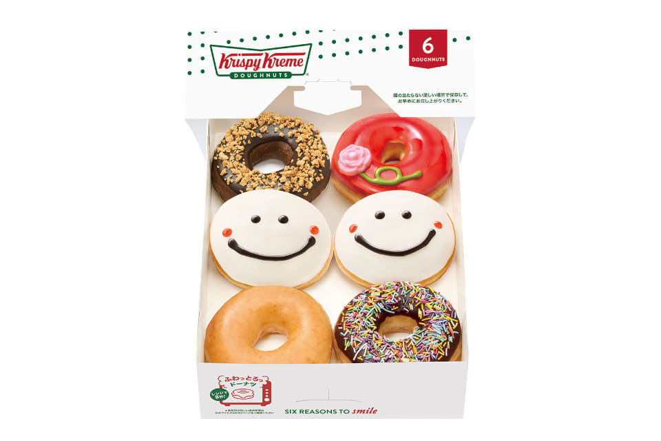 限定ドーナツ「ストロベリー クリーム スマイル」2個と「フラワー ストロベリー」に、定番の「オリジナル・グレーズド」「チョココート スプリンクル」「ダブル チョコ クランチ」をそれぞれ1つずつ合わせた6個入り。