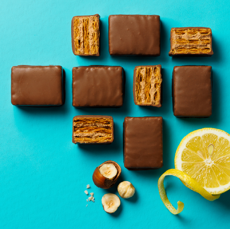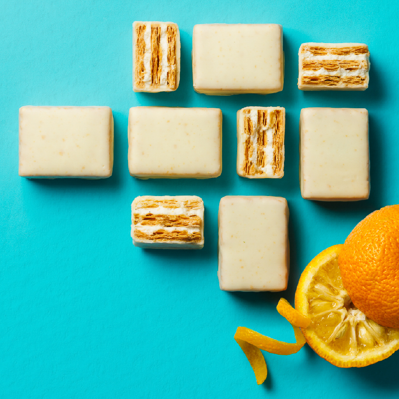 マダガスカル産バニラと国産柚子ピールで仕立てたクリームをパイでサンドし、ホワイトチョコを纏わせた。バニラの華やかな香りと柚子のほろ苦さが織りなす。