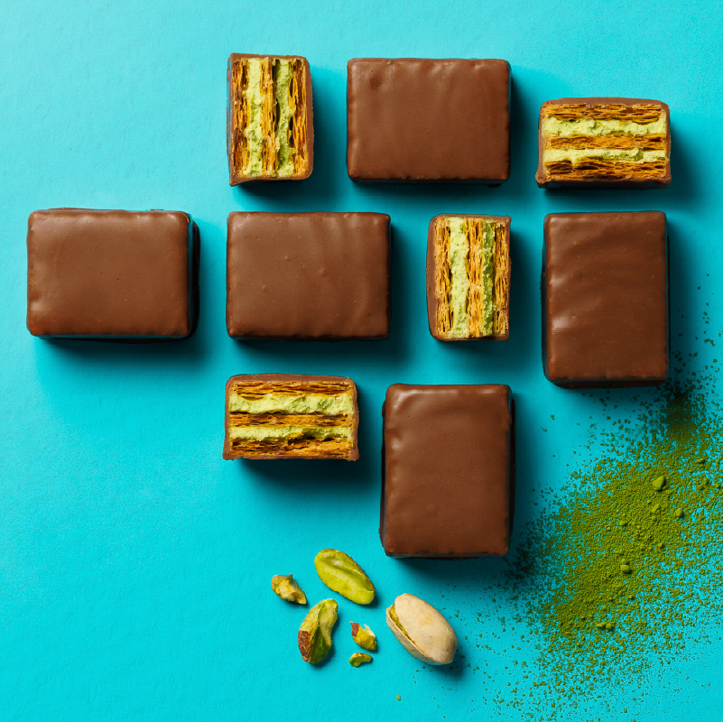 宇治抹茶とピスタチオペーストで仕立てたクリームをパイでサンドし、ミルクチョコを纏わせた。抹茶のほろ苦さとピスタチオのまろやかなコクが重なり合う。