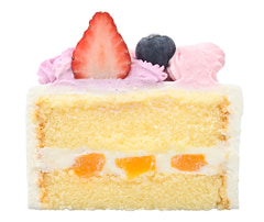 花束をイメージしたプチデコレーションケーキ。黄桃シロップ漬けと生クリーム入りホイップクリームをふんわりスポンジでサンドし、苺クリームとブルーベリー風味クリームの2色を絞って苺とブルーベリーを飾った。フィルムにはバラをデザインしている。
