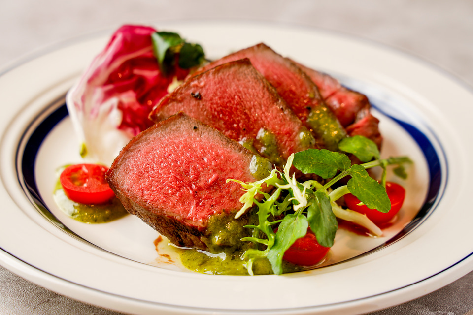 表面は香ばしく焼き上げ、中はしっとりとしたミディアムレアに仕上げた「厚切り牛タンステーキ」なども提供。ナイフを入れた瞬間の弾力と、噛みしめるたびに広がる濃厚な旨みが特徴で、爽やかなグリーンソースが脂の甘みを引き締め、付け合わせの彩り野菜が後味を軽やかに演出するという。