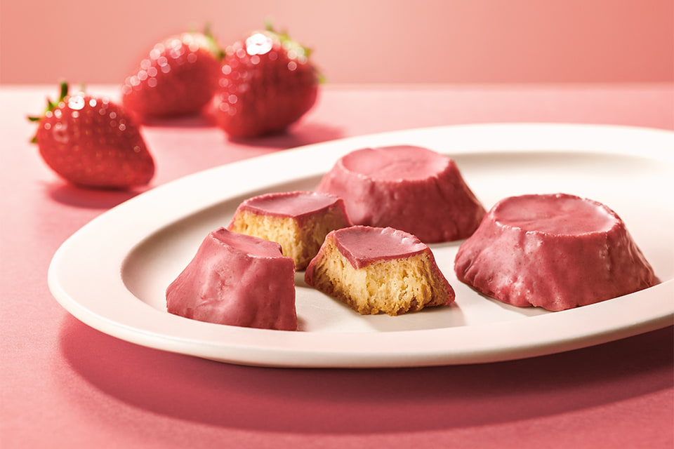 全体の3分の1以上がバターの「究極のバターリッチクッキー」に、苺を40%配合(生換算)した濃苺ショコラをとろりと流しかけた。ジュワッとあふれる発酵バターのコクと、甘酸っぱい濃苺フォンデュが贅沢にとろける。