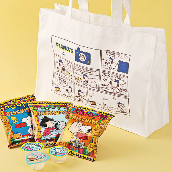 PEANUTSのマンガデザインのトートバッグで、スヌーピーたちがかわいらしくあしらわれている。バッグのサイズは約320×220×92mm(持ち手含まず)。ゼリーやスナックなどのお菓子が付いて、価格は1089円。