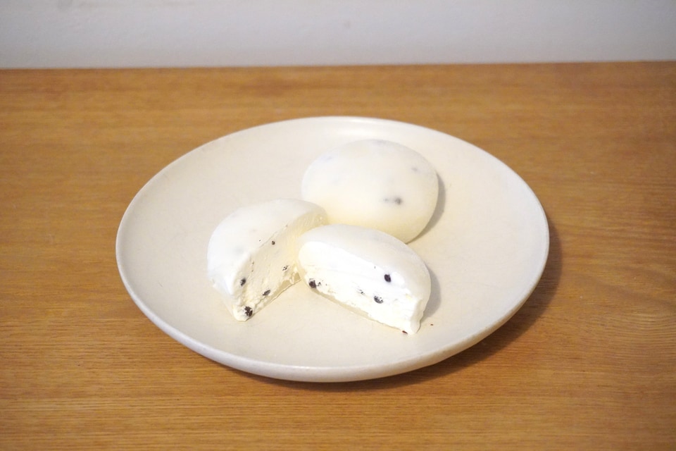 開いた感じは、一見いつもの雪見だいふくのようだが、よく見るとチョコレートパフの黒い点々が見える。