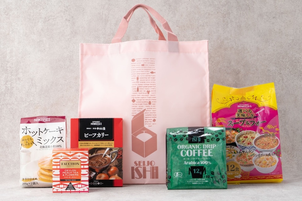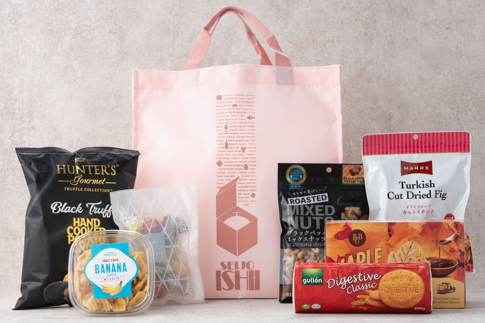今シーズンは4種の「店頭限定福袋」に加え、30種の「オンライン限定福袋」をラインアップする。すべての福袋にオリジナルのエコバッグ「成城石井 ショッピングバッグ」がセットになっており、店頭限定福袋ではライトシナモンとパープルピンク、オンライン限定福袋ではネイビーオレンジが付く。