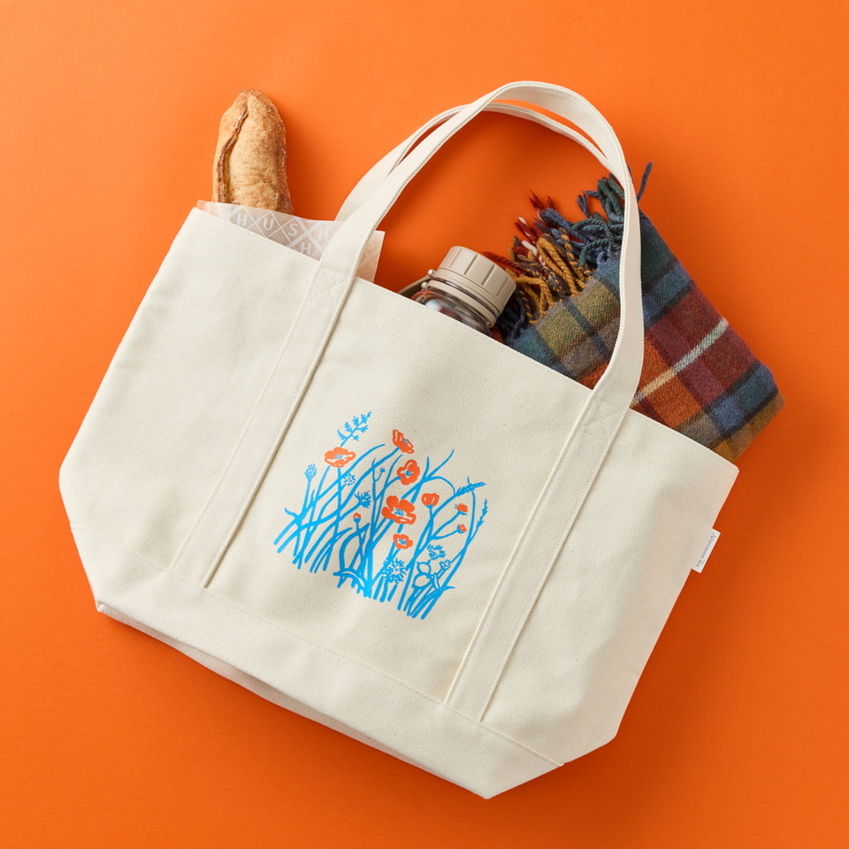 オリジナルバッグは庭に咲く花や植物のイラストをあしらった日常使いしやすいデザインとなっている。カラーはオフホワイト。
