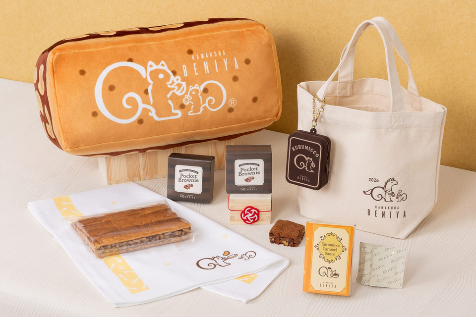 鎌倉紅谷の人気商品「クルミッ子」をモチーフにしたクッションやポーチ、「リス君」デザインのアイテムなどがセットになったもので、店舗やオンラインストア、百貨店などで販売する福袋の内容や販売スケジュールが異なる。