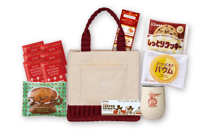 また、コメダ珈琲店のソファー柄生地を使用した「どむぞうくんキーホルダー」や、コメダのくつろぎナビゲーター「コメダンディ」と「どむぞうくん」が一緒に描かれたイラスト入りのプレート、ステンレスタンブラーなどが入る。そのほか、福袋オリジナルデザインのドリップコーヒーや、コーヒーチケット、スナックチケットもセットになっている。