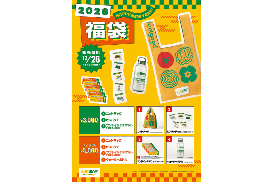 サンドイッチチェーン「サブウェイ」(WATAMI FAST CASUAL MANAGEMENT)は「サブウェイ 2026 福袋」を数量限定で12月26日に発売する。