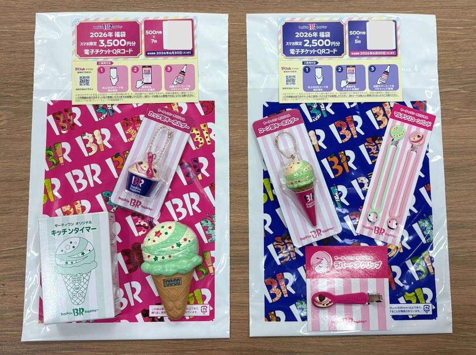 こんにちは! サーティワンアイスクリームの福袋担当です。サーティワンアイスクリームでは、日頃のご愛顧に感謝し、2026年もお得な福袋を販売いたします。お好きな商品に引き換えることができる3500円分または2500円分のスマホ限定500円チケットと、福袋限定のかわいいオリジナルグッズが付いてきます! オリジナルグッズは、かわいいアイスクリーム型のキッチンタイマーやキーホルダーなど、おうちの中でも外でも使えてみんなに自慢したくなるアイテムをラインアップ。数量限定なので、早めにGETしてください!