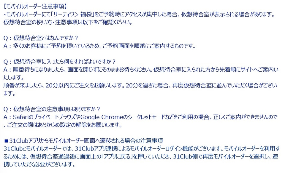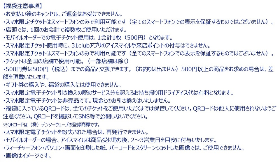 3500円福袋は、電子チケット500円券×7枚(計3500円分)、2500円福袋は、電子チケット500円券×5枚(計2500円分)のスマホ限定電子チケットが入っています。電子チケットは、31Clubアプリにも保存ができるので、使いたいときにいつでも使用することができます! 電子チケット有効期間は、2026年1月1日~6月30日です。なお、一部店舗ではご使用できません。
