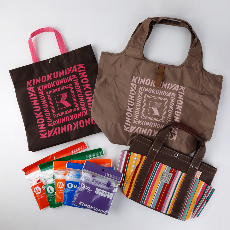 内容: スライドジッパーバッグ(5個セット)、4ポケットトートS ブラウン、カラーエコスペシャル ブラウン×ピンク、まとまる保冷バッグ クルミ 各1点