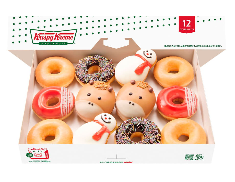 2026年の干支である“午(ウマ)”をモチーフにした”干支ドーナツ”「キャラメル ホース カスタード」とお正月飾りのような鮮やかなドーナツ「ラッキー ストロベリーリング」、ウィンターシーズン限定で登場する子どもから大人まで多くの方に愛される冬の定番「チョコレート スノーマン」に、人気No.1の「オリジナル・グレーズド」、子どもに人気の「チョコ スプリンクル」を詰め合わせた、新年にぴったりな華やかでお得な12個入りのボックスがセットになっています。
