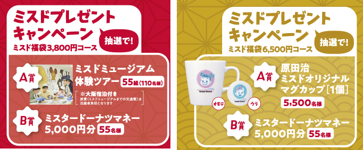 今回「ミスド福袋2026」をご購入いただいたお客様限定で、ミスタードーナツをさらに楽しめるキャンペーンも展開します。それぞれの福袋に入っているドーナツ引換カードが応募券となり、ミスタードーナツアプリからご応募いただくと、抽選でミスドミュージアム体験ツアーやこのキャンペーンだけのオリジナルデザインの原田治オリジナルマグカップが当たります。