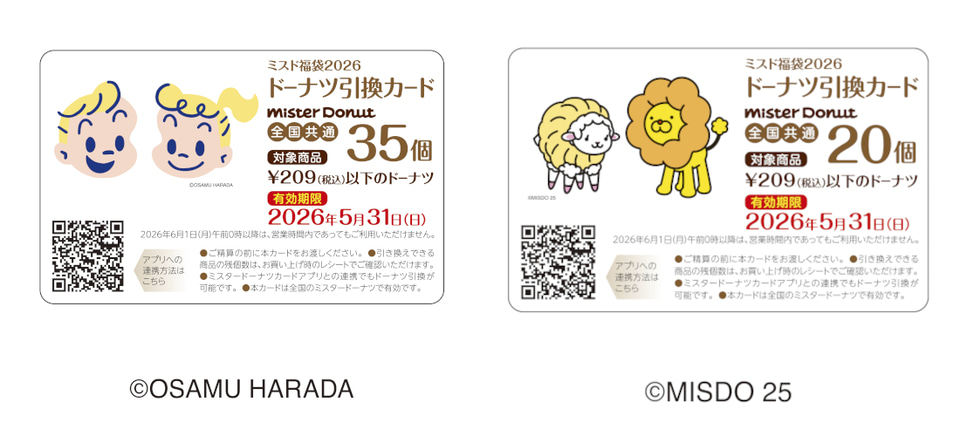 こんにちは! ミスタードーナツです。12月26日から順次販売する「ミスド福袋2026」をご紹介させていただきます。今回の福袋はミスタードーナツ創業55周年を記念し、お客様への感謝を込めて、販売のご要望を多くいただいたミスタードーナツのオリジナルキャラクターである「ポン・デ・ライオンと仲間たち」をデザインに使用した福袋と、「原田治さん」のイラストをデザインに使用した、「ミスド福袋2026」全2種を発売します。