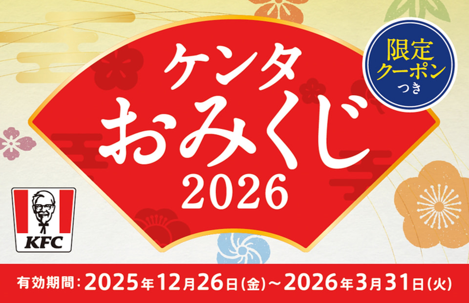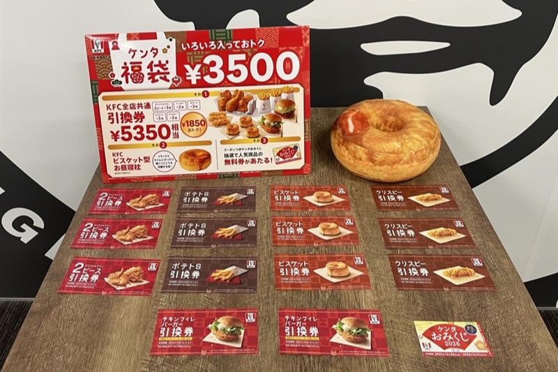 こんにちは! ケンタッキーフライドチキンの福袋担当です。2026年の「ケンタ福袋」は、総額5350円相当のKFC全店共通引換券に加え、初登場の限定アイテム「ビスケット型お昼寝枕」がセットに。人気メニュー「ビスケット」の親しみやすさを日常でも感じていただきたいという想いから生まれた、直径約20cmの使いやすいサイズが特徴です。お昼寝やリラックスタイムにぴったり。さらに、抽選で人気商品の無料券が当たる「ケンタおみくじ」付きで、価格は3500円ととってもおトク。2026年のスタートは、ぜひKFCで!