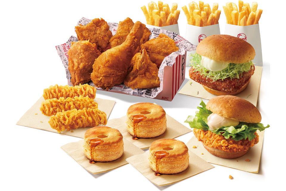 オリジナルチキン2ピース×3枚、バーガー×2枚、ポテトS×3枚、ビスケット×3枚、カーネルクリスピー×3枚