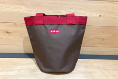 なか卯の赤いワッペンがアクセントになった、落ち着いた風合いのトートバッグです。裏地に施した、なか卯の「こだわり卵」をモチーフにしたたまごデザインがこだわりポイントです。バケツ型で大容量のため、荷物が多い日のお出かけにもぴったりです。
