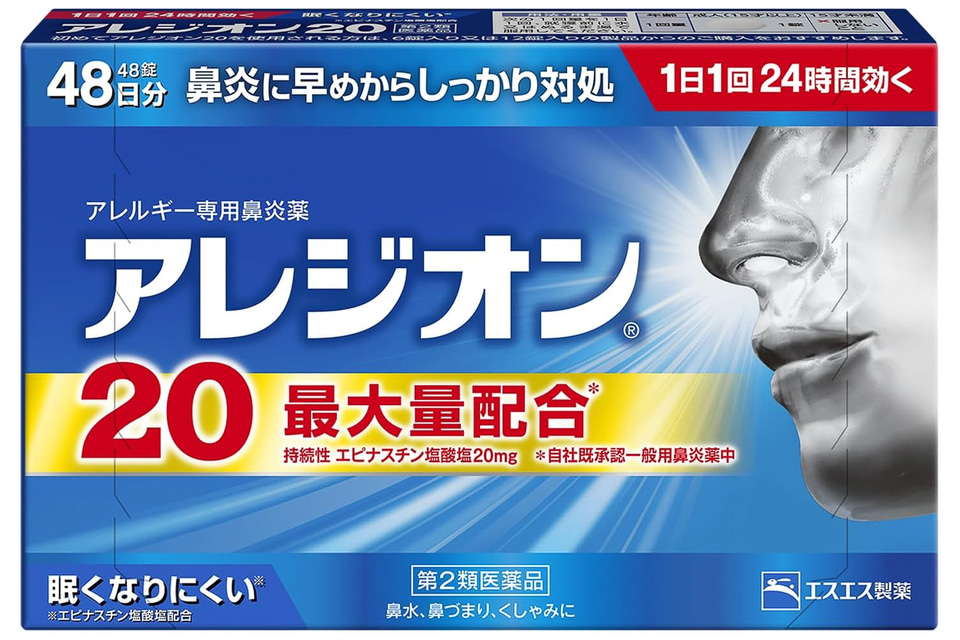 アレジオンは花粉、ハウスダスト(室内塵)などによる鼻みず、鼻づまり、くしゃみといった鼻のアレルギー症状の緩和に効果のある第2類医薬品。1日1回の服用で24時間効くとしている。