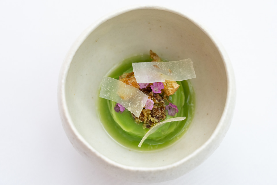 2皿目は、アスパラガスをパスタ状に仕立てたという温製前菜。アスパラガスのピュレの爽やかなグリーンにふきのとうのほろ苦さ、白い器に映えるアートのような見た目など、五感で“里の春”を感じることができる一品でした。