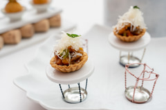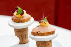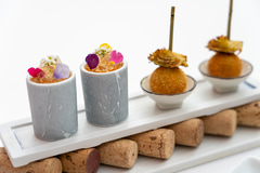 続いて登場するのは4種類の小さな前菜です。イタリア風コロッケや鶏レバームース、イタリアの豆料理ウッチェレットが乗ったブルスケッタなど、ワインにぴったりの一口サイズのおつまみは「どれから食べようかな!?」というワクワク感も一緒に楽しめます。