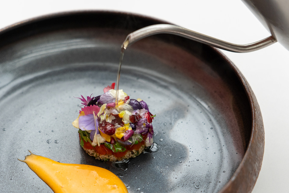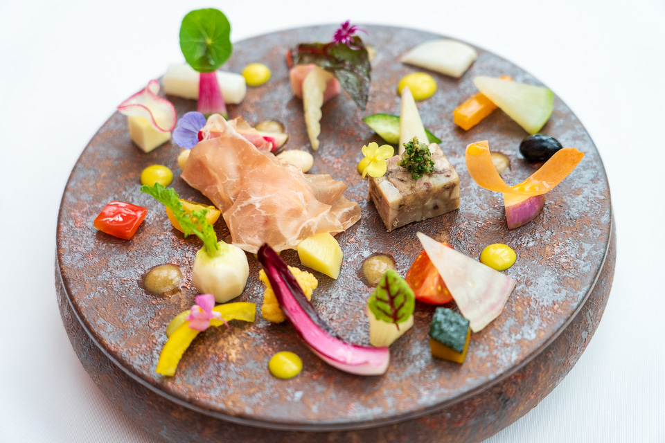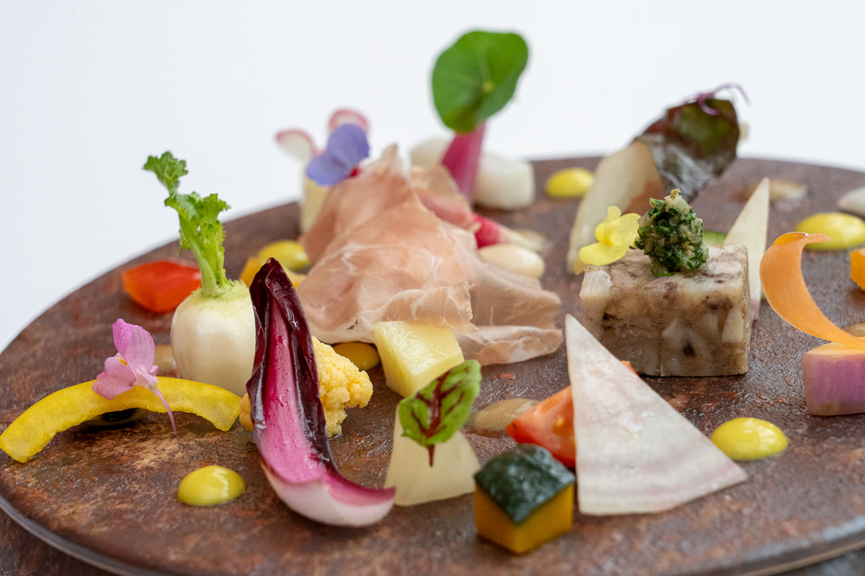 イタリアの郷土料理をベースにしたこの地域ならではのメニューには、ソムリエが約2000本の豊富なワインセラーから厳選した8本とのワインペアリングをプラスするのがおすすめ! さっそく全10皿を順番にご紹介しましょう。