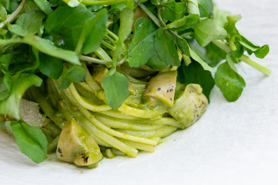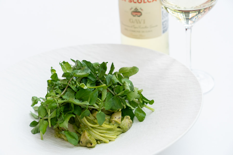 ここでパスタが登場です。まずは春が旬のクレソンをふんだんに使ったグリーン一色のパスタ。「最初にクレソンだけを味わってみてください」と言うだけあって、さわやかな辛味と独特の香りがクセになりそう!