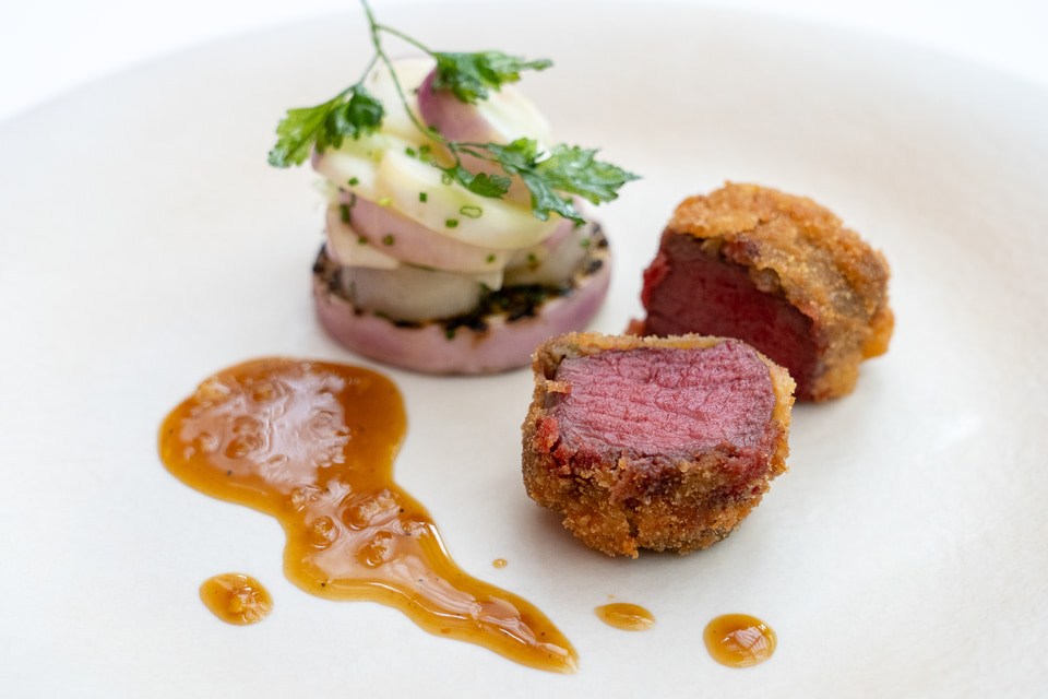 いよいよメインのお肉料理の登場です。出てきたのはお肉の赤身断面に目が釘付けになる「蕪と鹿肉のコトレッタ」。鹿肉はいぶりたくあんをまとわせてから衣をつけて揚げているそうで、ほんのりスモーキーな香りとたくあんの食感が感じられる手の込んだ一品。山梨伝統の万能七味「すりだね」に柚子の塩漬けを加えたソースでいただきます。