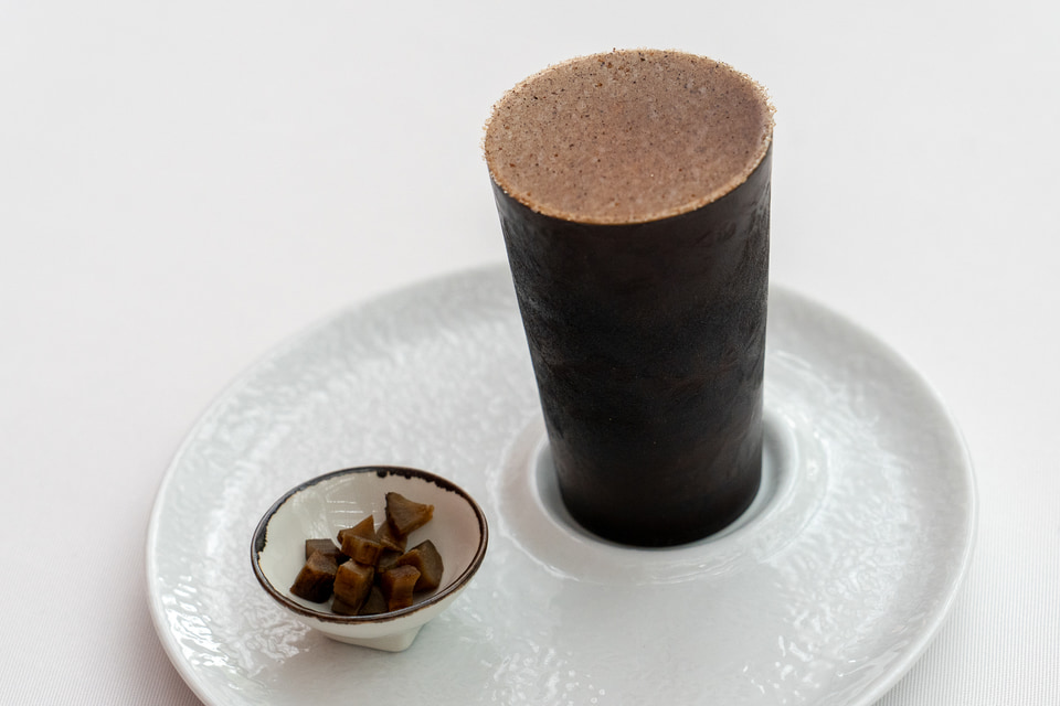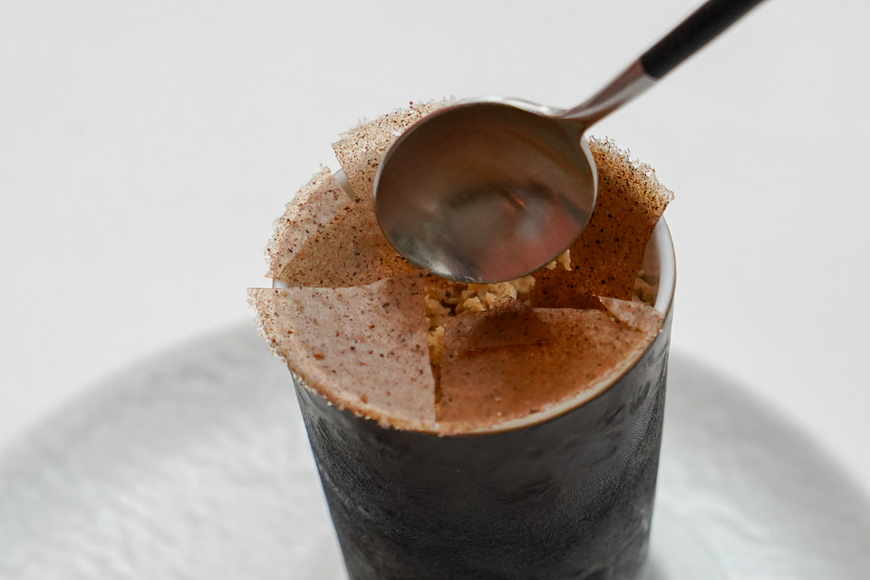 ドルチェは2皿でてきます。1つ目は、牛蒡のティラミス。すべてのお料理に野菜が使われているとはいえ、ティラミス×牛蒡とは恐れ入りました!小皿には砂糖で甘く煮詰めた牛蒡のコンポスタ。これを途中で加えて味変を楽しむのもおすすめです。
