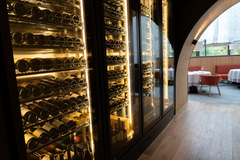 リゾナーレ八ヶ岳で限定3室の「ワインスイートメゾネット」は、ワインを楽しむために造られた特別なゲストルームです。1階が広々とした寝室で、螺旋階段を上がった2階がワインセラーを設えたリビングスペースになっています。