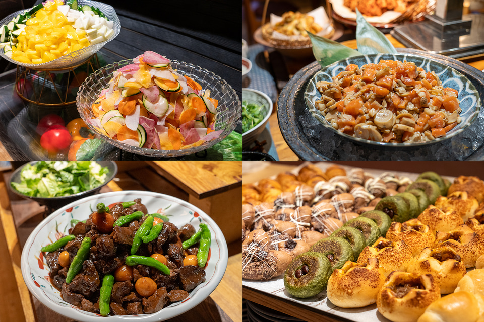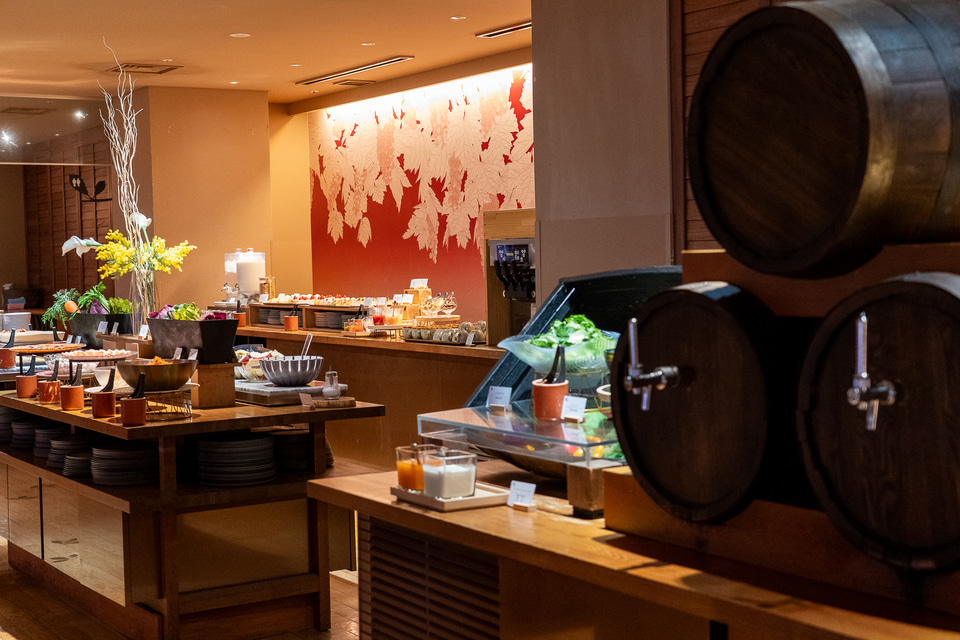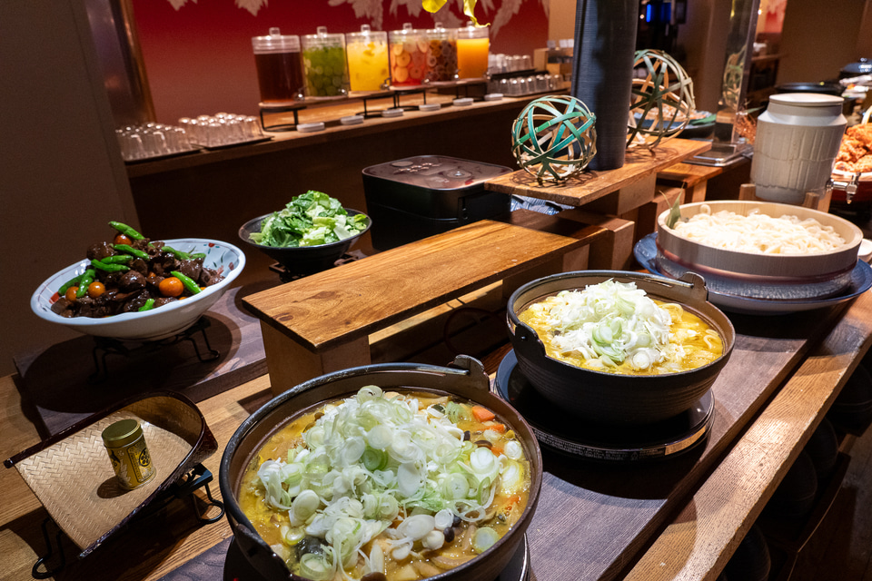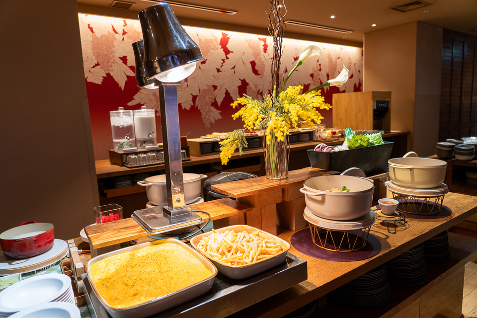 お楽しみの朝食は、ホテル棟1階にある「YYgrill(ワイワイグリル)」へ。ずらりと並んだビュッフェは和食と洋食どちらもあって、野菜をふんだんに使ったお料理がそろっています。みずみずしいカラフル野菜も盛りだくさんで、サラダの盛り付けには思わず力が入っちゃうかも。また、ほうとうや鳥もつ煮、鶏肉の山賊揚げなどの山梨ご当地グルメコーナーも大人気。くれぐれもお腹の配分にはご注意を!