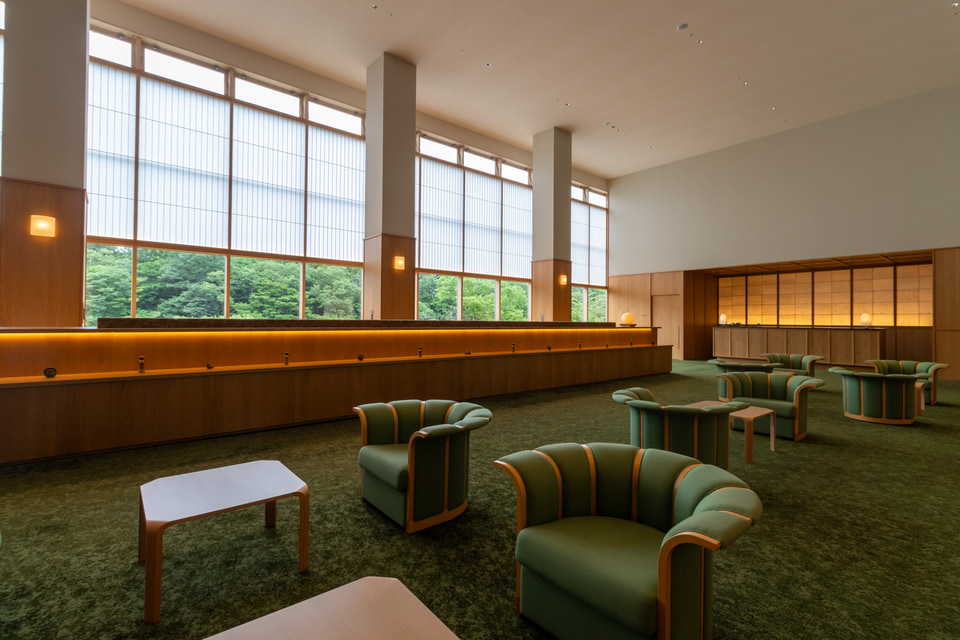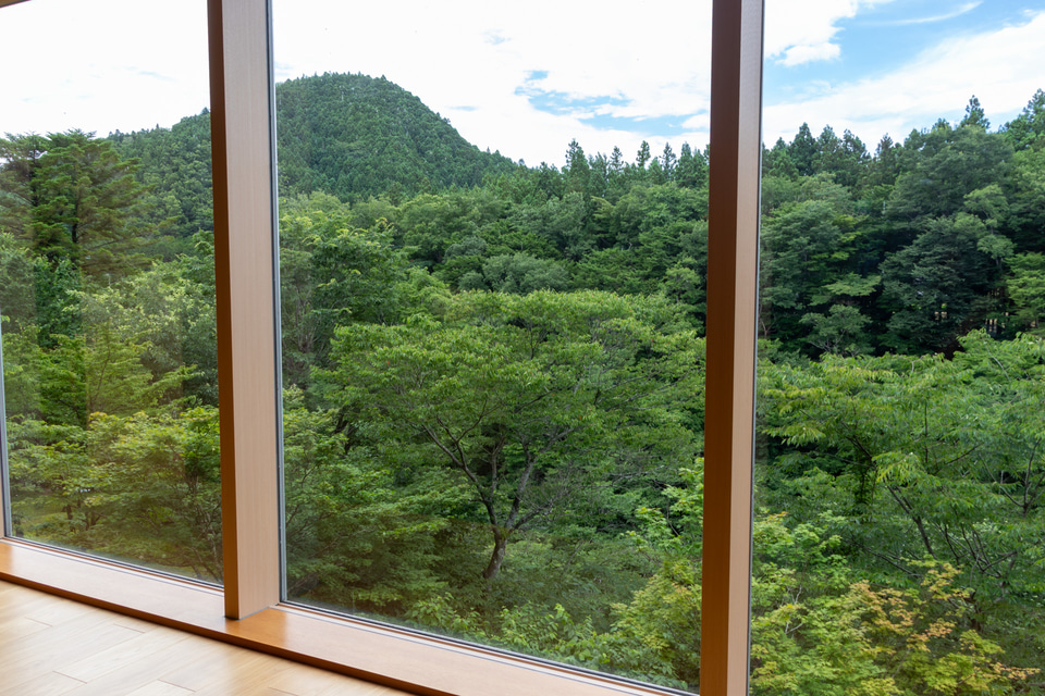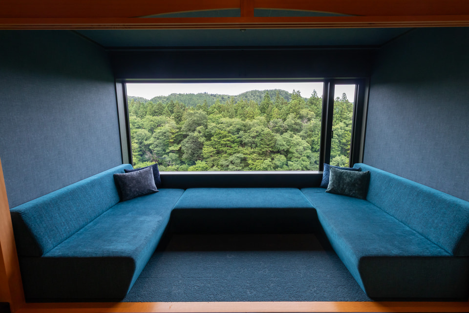 居心地のよさとその土地の個性を追求した「ご当地部屋」として用意されているのは、全室が渓流・名取川を目の前にした「紺碧の間」。秋保温泉の渓谷、磊々峡から着想を得た紺碧色に染め上げられたソファーと空間からは、四季折々で変化する美しい景観をくつろぎながら楽しめます。実際にこちらでゴロリと景色を眺めていたら、いつの間にやら夢の中へとご招待されていました。