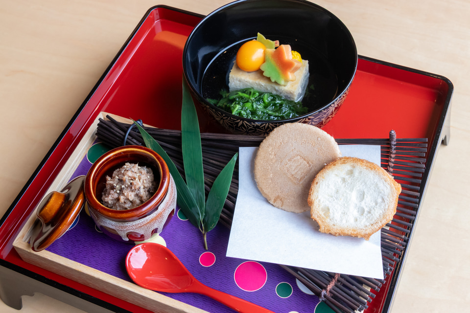 最初に提供されるのは「先付け」と「煮物椀」で、伊達政宗公が着用していたといわれる、水玉模様の陣羽織の柄を敷いた器が目を引きます。新伊達会席は大名の食事をイメージしているので、脚つきのお膳にのせて提供されます。