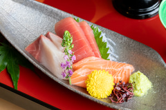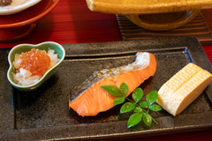 次に登場するお膳は、八寸・酢の物・お造りを一緒に盛り合わせた「宝楽盛り」です。八寸は「合鴨ロース」「干し柿と胡桃の酪」「鮭の幽庵焼き」「鶏と葡萄の松風」「秋刀魚と茸の有馬煮」「落花生豆腐」、酢の物は「北寄貝と若芽」、お造りは取り合わせで、この日はサーモン、マグロ、カンパチが提供されました。