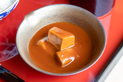 メインのあとに用意されているのは、食事と炊きものです。食事は白米に香の物を添え、仙台味噌を使った留め椀が提供されます。炊きものとして用意されるのは「牛タン柔らか煮」です。ふかひれに続いて仙台名物の牛タンまで楽しめるのもうれしいですね。