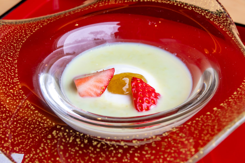 デザートには「ずんだと蔵王ヨーグルトの松島仕立て」が提供されます。枝豆を使った“ずんだ”も仙台名物の一つで、日本三景の一つである“松島”をフルーツを使って表現した涼やかなメニューです。口に含むと「あっ、枝豆!」と分かる野菜らしさが、味わい深いヨーグルトとともにさっぱりとした甘さで楽しめます。