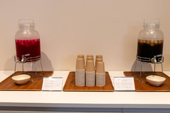 湯上がり処では、名取川と埋もれ木の情景を感じる空間で、ゆっくりくつろぐことができます。無料で用意されている「赤紫蘇ジュース」や「界オリジナルブレンド はだか麦茶」で水分補給し、冷えたアイスキャンディーを頬張りながら涼むこともできます。そして、界 秋保の湯守りが、秋保温泉の歴史とともに泉質や効果的な入浴法を紹介する「温泉いろは」に参加するのもおすすめの過ごし方です。