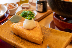 吟醸豆腐や三角揚げは好みで味付けできるように、大名醤油、オリーブオイル、塩竃の藻塩、小口ねぎ、糸かつおが一緒に提供されます。めずらしさもあり、オリーブオイルと藻塩をかけたところ、大豆の風味がダイレクトに伝わる美味しさを体験できました。よい豆腐を買ったときは自宅でも試してみることにします。