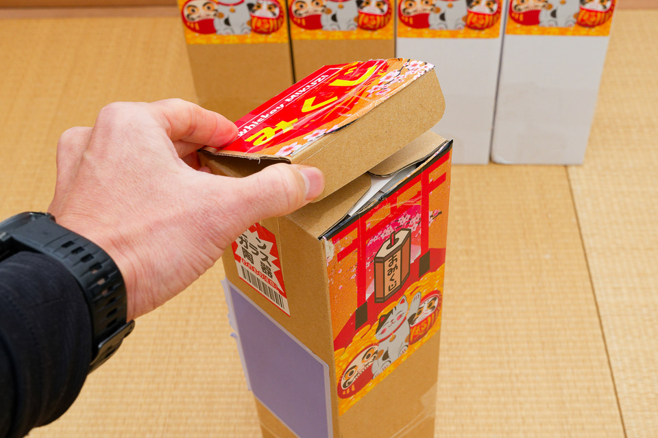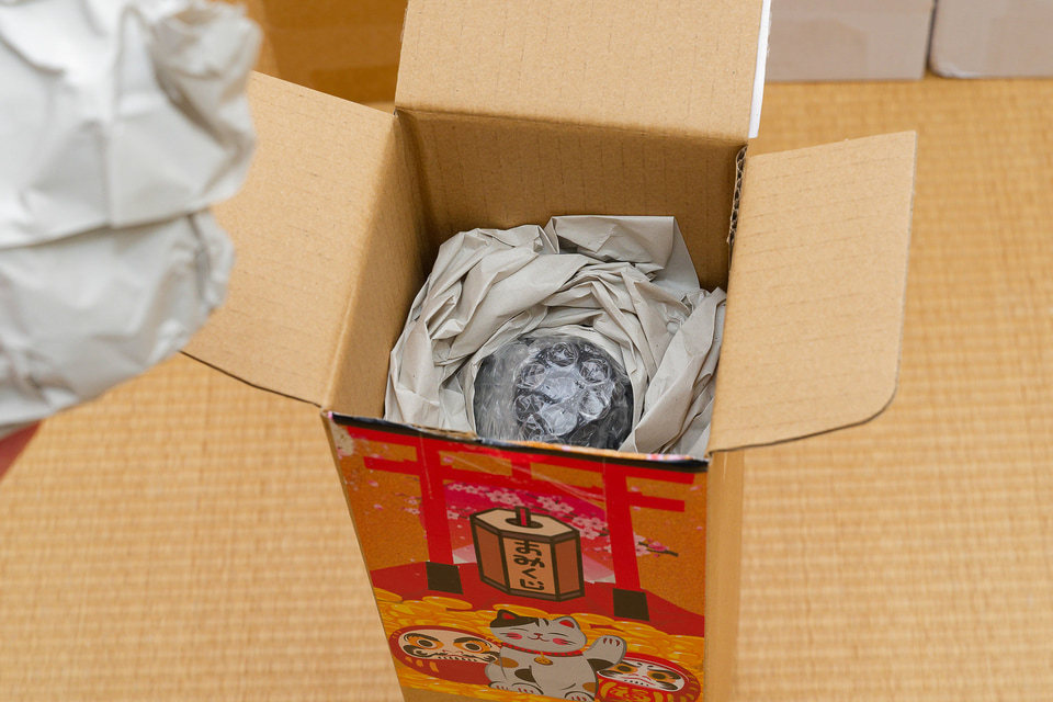 待ちきれずに自宅待機(といっても自宅=仕事場ですが)していた筆者は、ウイスキーが届いた瞬間にいったんほかの仕事を放り出し、開封の儀に取りかかることに。写真では6本分の箱が見えますが、1箱はおそらく輸送の都合を考慮した空箱です。「みくじ」のラベルが貼られている箱がウイスキーの入ったものになります。