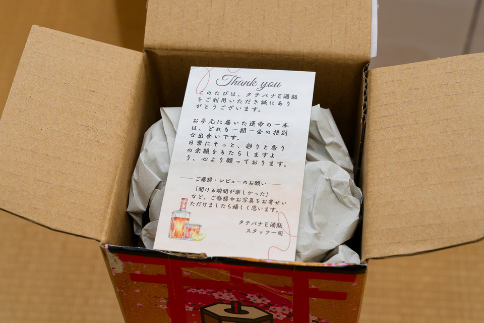 わりと堅めのしっかりした箱を1つずつ開封していきます。まずは1本目、上部から開くと中には運営元からのメッセージカードが。その下には緩衝材が詰め込まれており、取り除くといよいよウイスキーボトルが見えてきます。