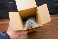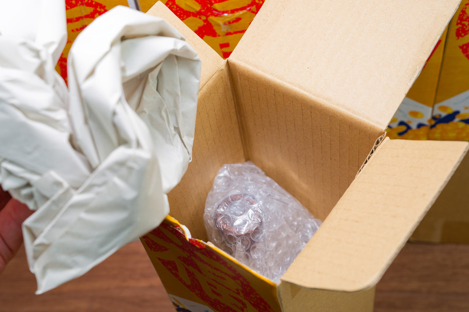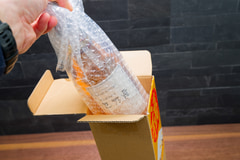 テキトーに並べたところから1本目、上部を開けるといつも通りグリーティングカードが現れます。緩衝材とともに取り出して、中を覗くと茶色っぽいボトルの頭が顔を見せました。あまり見たことのない色かも……と思いつつ引き出してみると「THE YAMAZAKI」の文字が!