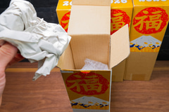 そうして数日後に届いた5本分のパッケージ。大きな「福」の文字と財宝ジャラジャラな富士山がプリントされたラベルが「福袋みくじ」らしさを演出しています。今回も1本ずつ「開封の儀」をしていきましょう。