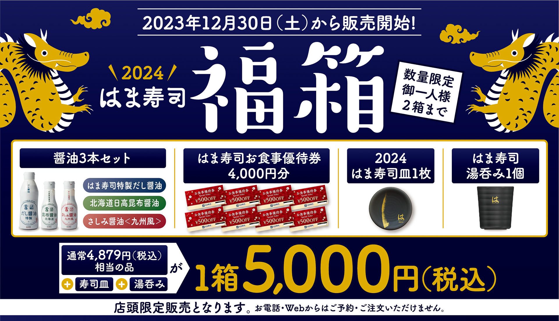 はま寿司「福箱」は食事券4000円分/醤油3本/寿司皿/湯吞みで“5000円”の福袋