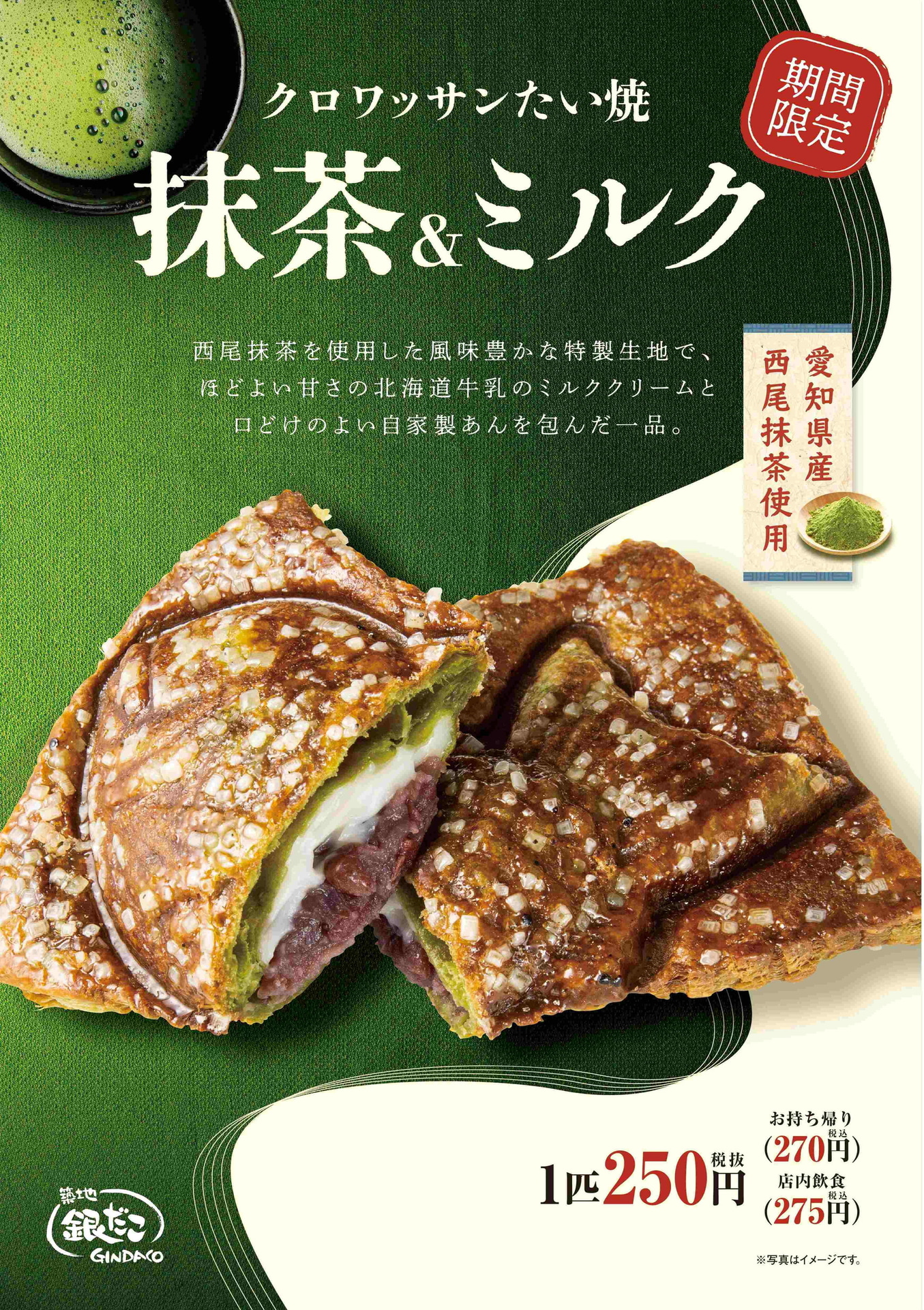 • 築地銀だこ、愛知の「西尾抹茶」を使ったクロワッサンたい焼き「黒みつ抹茶ミルク」発売