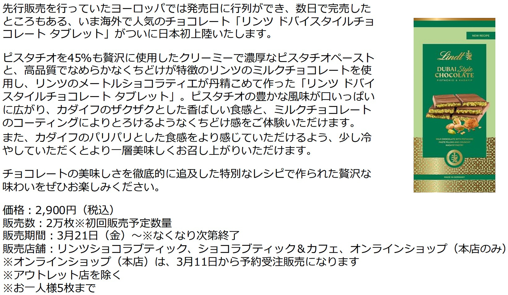 リンツ「ドバイスタイルチョコレート」に「プラリネ」と「バー」が新登場。第1弾2万枚は3日で完売