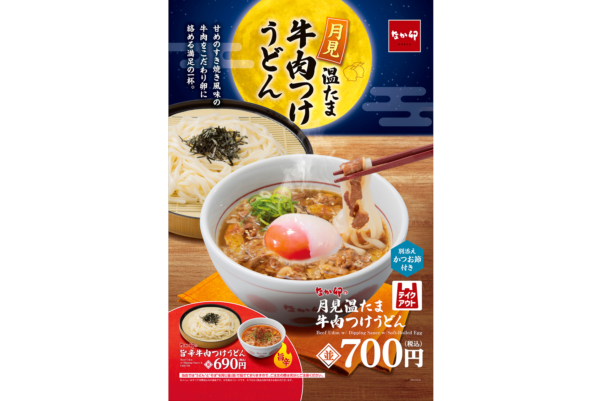 なか卯「月見温たま牛肉つけうどん」9月3日発売