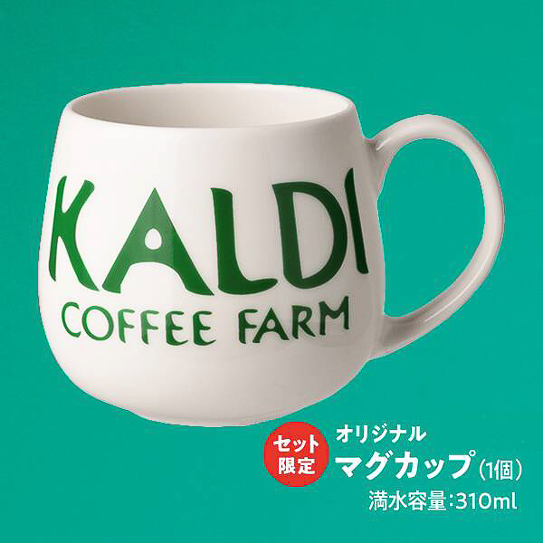 カルディ、ぽってりフォルムにグリーンのロゴをデザインした「ドリップコーヒー&マグカップセット」発売(3/7)